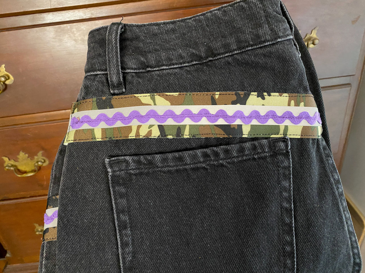 Gently used wide leg, Dynamite jeans embellished with camouflage reflector tape and purple ric rac on the back and around one leg.