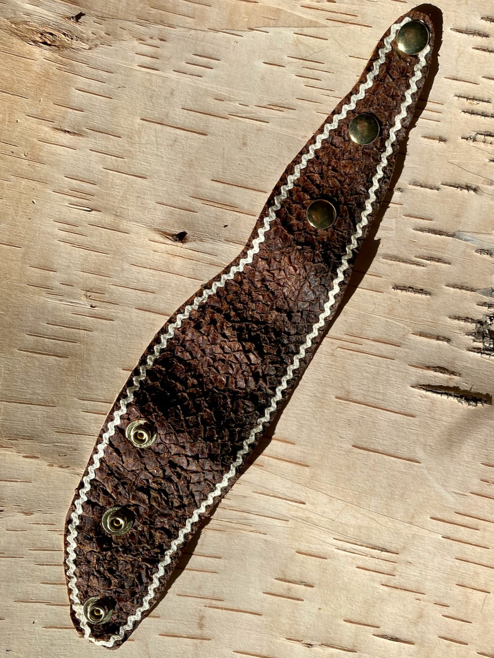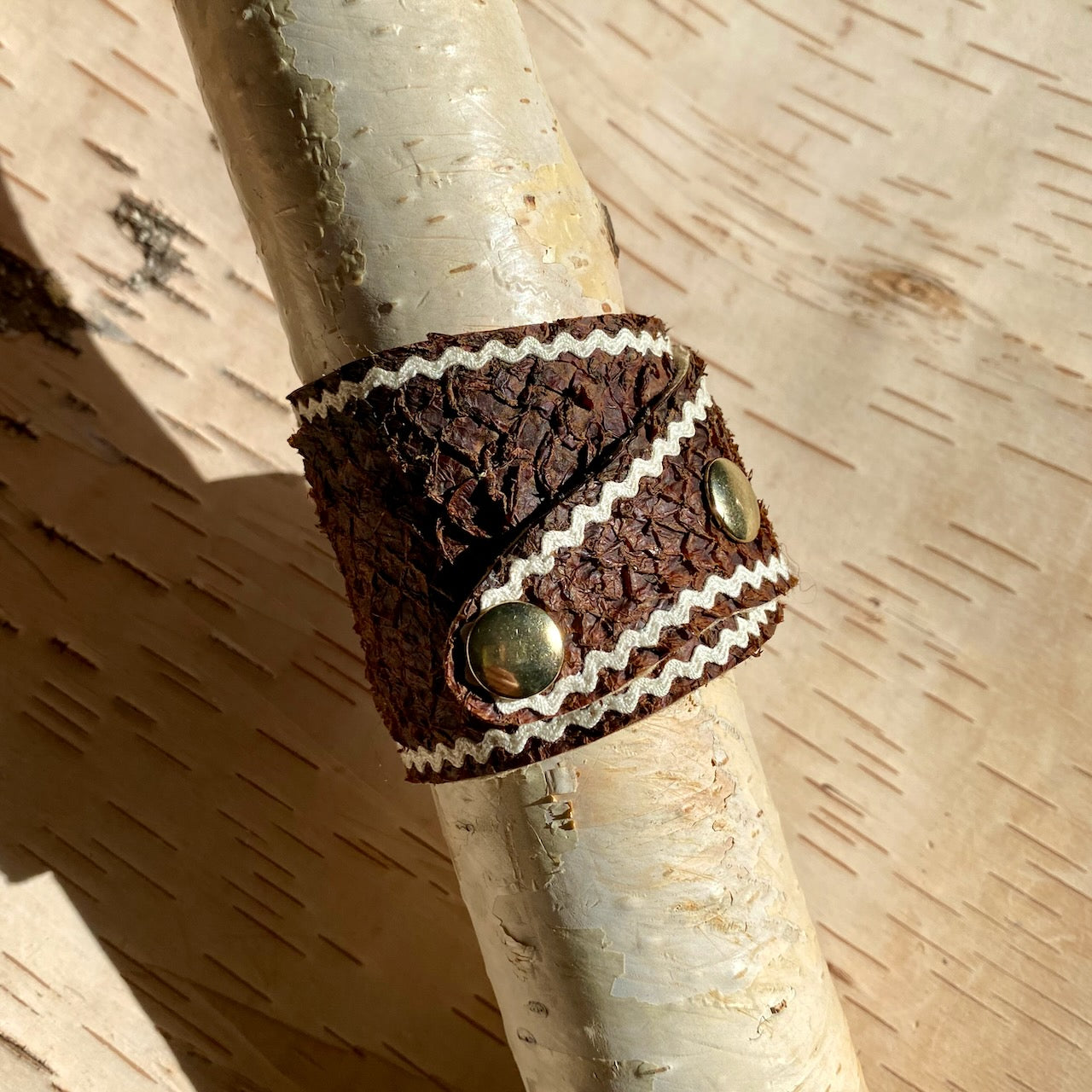 Cuff made with tea-tanned whitefish skin, smoked hide, rick rack and 3 metal snaps.