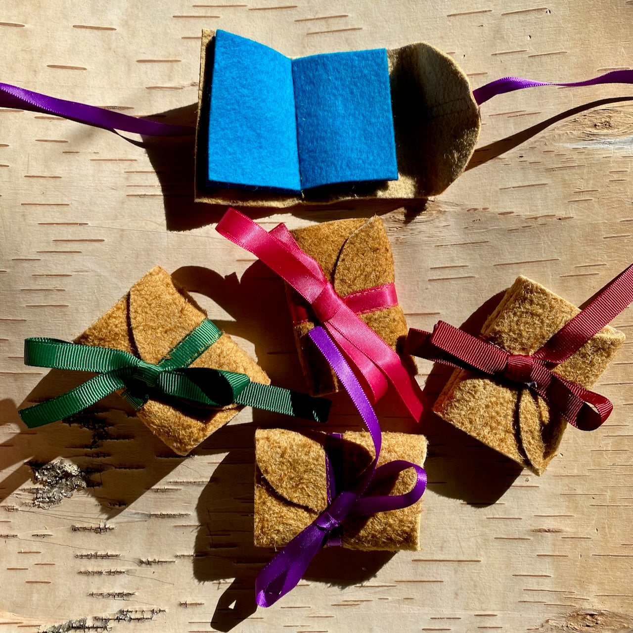 1.75" x 2.75" needle book with 4 needle pages, made with smoked moose hide, ribbon, and felt.