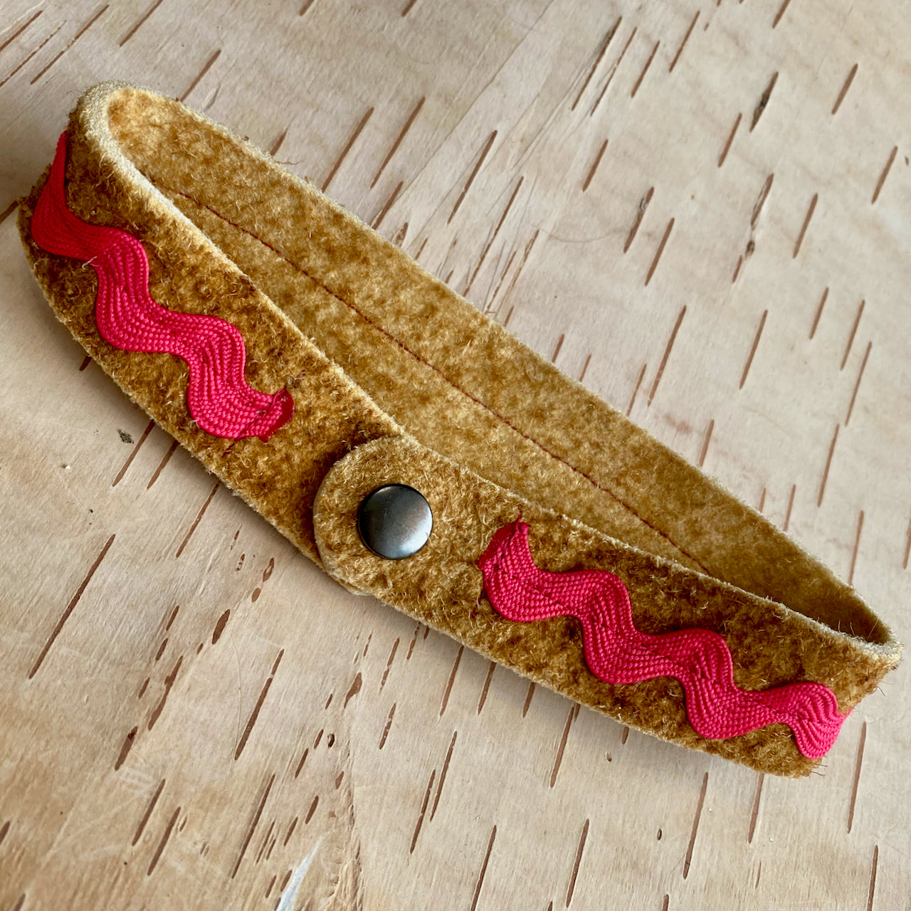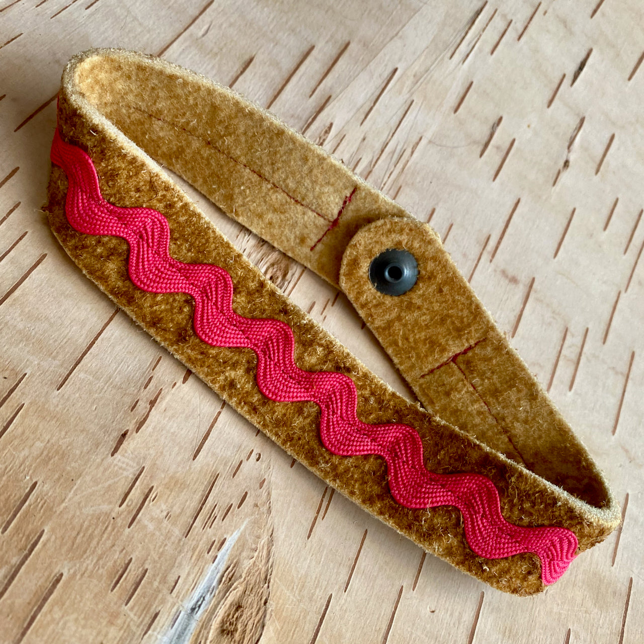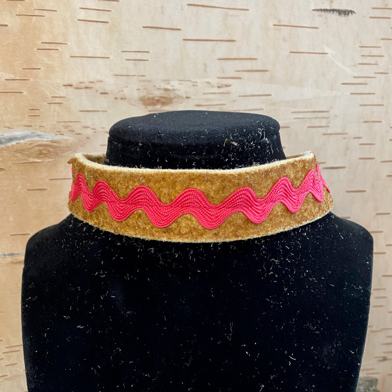 Smoked moose hide band embellished with jumbo hot pink ric rac, closed with a metal snap. Depending on width the band can be worn as a choker or double wrapped cuff.